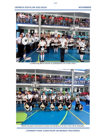 111 CRÓNICA ESCOLAR 2022-20235 NOVIEMBRE La Marching Band durante su participación en el acto cívico. Banda de guerra entonando el toque de bandera en el acto cívico de la olimpiada. ¡FORMAR PARA CONSTRUIR UN MUNDO FRATERNO!