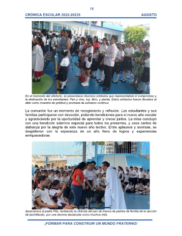 Apreciamos al padre Pita, recibiendo la ofrenda del pan de manos de padres de familia de la sección