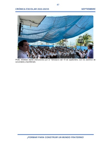 47 CRÓNICA ESCOLAR 2022-20235 SEPTIEMBRE Profe. Aristides dando indicaciones por el “Simulacro del 19 de septiembre, con los alumnos de secundaria y bachillerato. ¡FORMAR PARA CONSTRUIR UN MUNDO FRATERNO!