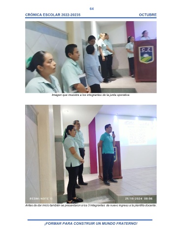 64 CRÓNICA ESCOLAR 2022-20235 OCTUBRE Imagen que muestra a los integrantes de la junta operativa. Antes de dar inicio también se presentaron a los 3 integrantes de nuevo ingreso a la plantilla docente. ¡FORMAR PARA CONSTRUIR UN MUNDO FRATERNO!